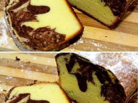 Toarnă 3 sferturi din amestecul de aluat într-o formă de chec căptușită cu hârtie de copt. La restul de aluat, adaugă cacao și amestecă. Toarnă compoziția peste stratul inițial și creează un model cu ajutorul unei furculițe.